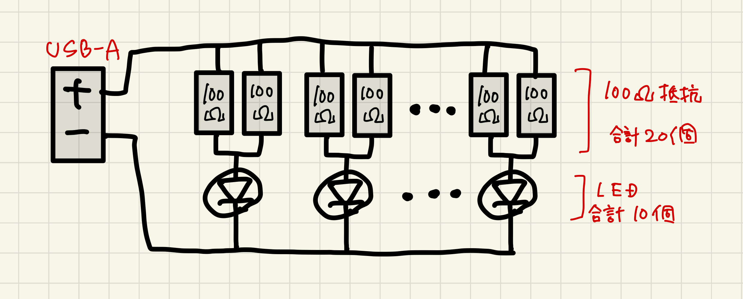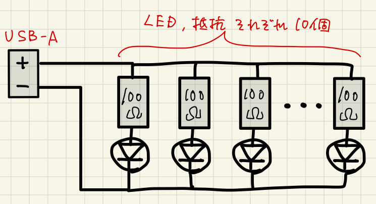 もう少し明るさを稼ぐのであれば、下記のように100Ωを2個並列にして電流を2倍にしてもいいかもしれないですね。(100Ω抵抗が全部で20個必要ですが。。)