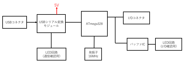 電源入力 : 5V(USBコネクタ→USBシリアル変換モジュール経由で各回路へ給電)