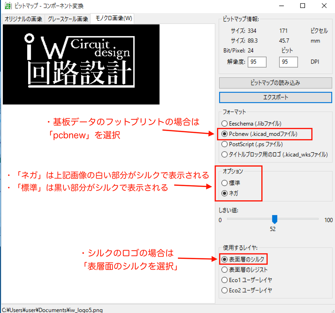 - 「ビットマップの読み込み」でロゴにしたい画像を選択して読み込みます。ロゴにしたい画像は2値のモノクロ画像で作成した方が良いと思います。