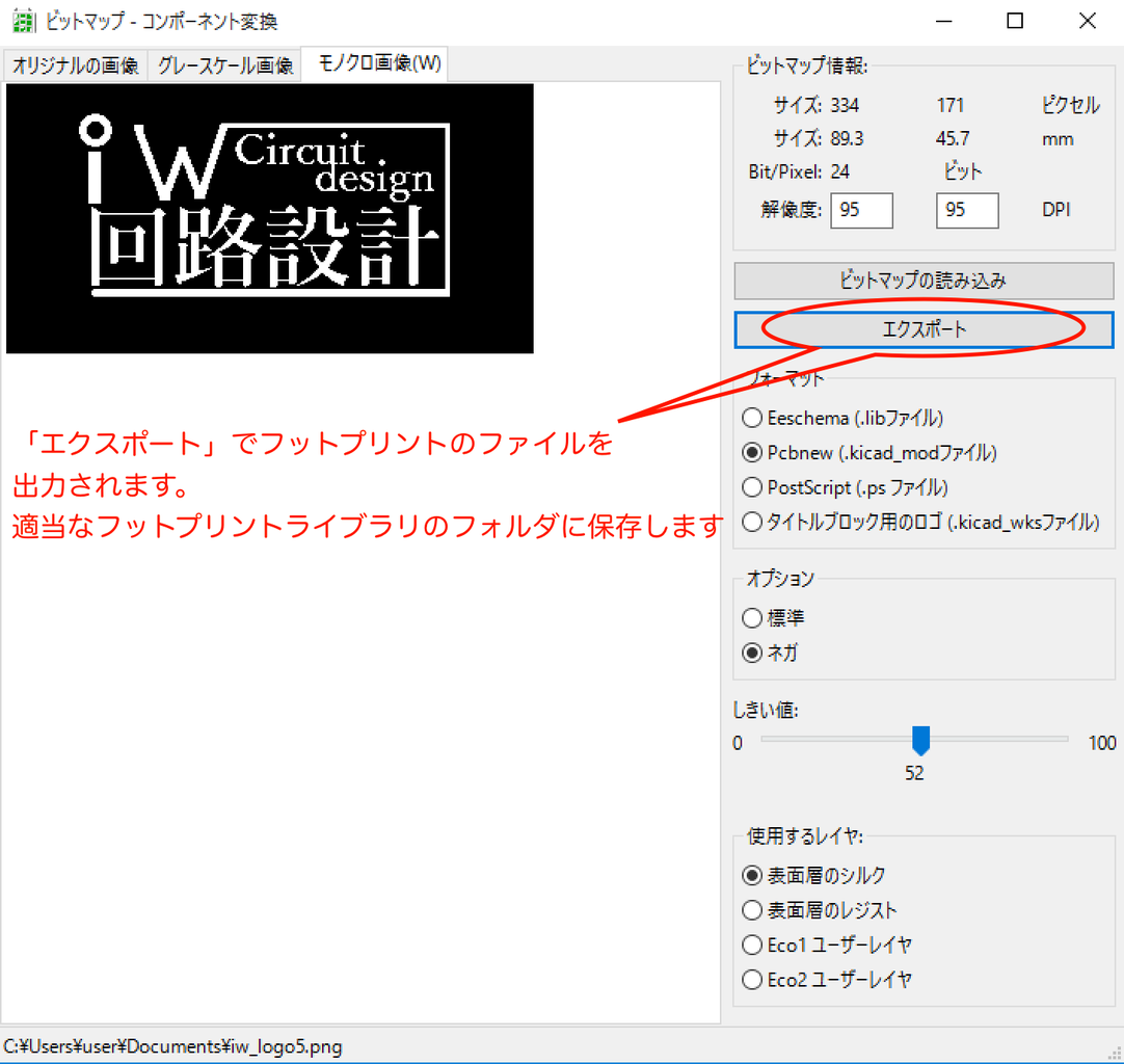 「エクスポート」でフットプリントのファイルとして出力されますので、適当なフットプリントライブラリのフォルダに保存します。