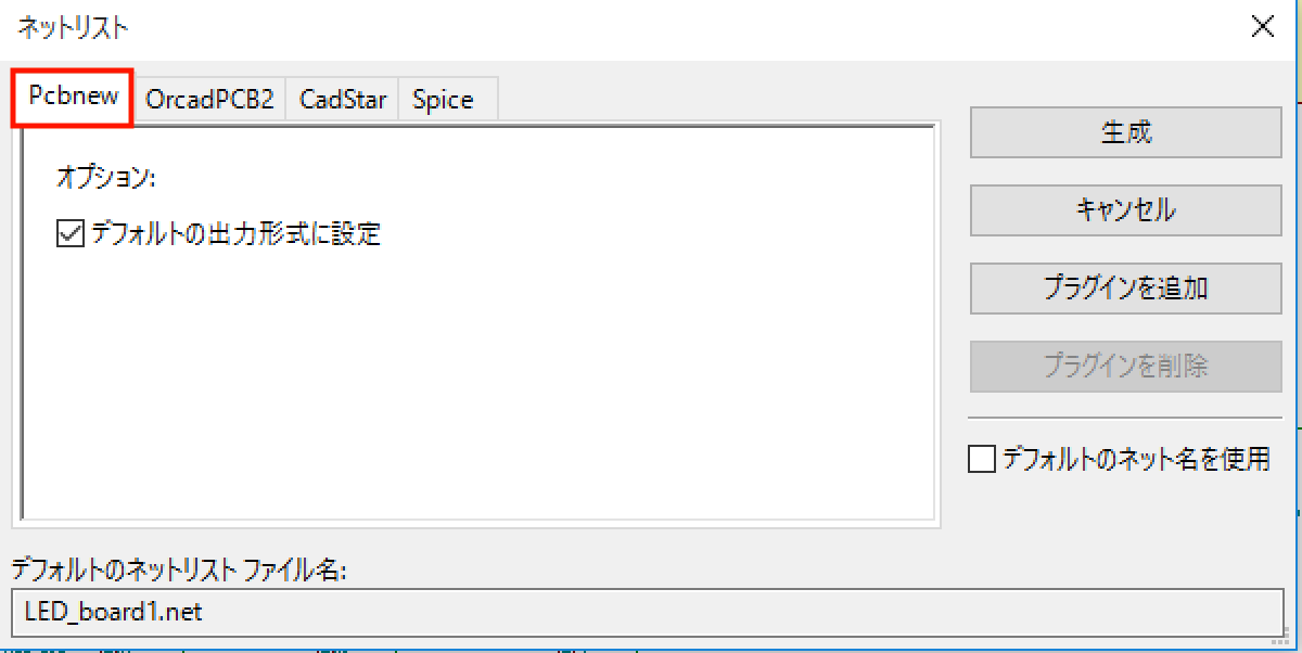 ネットリストのフォーマットがいくつか選択できますが、ここではKiCadの基板エディタを使用するのでKiCad専用フォーマットの「Pcbnew」タブを選択します。