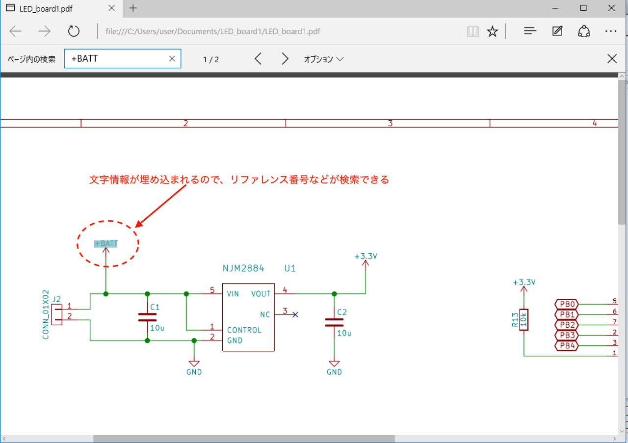 このプロットの機能でPDF出力した場合は回路図上の文字(リファレンス番号など)が文字として埋め込まれますので、PDFビューア上で特定のリファレンス番号を検索することなどができます。