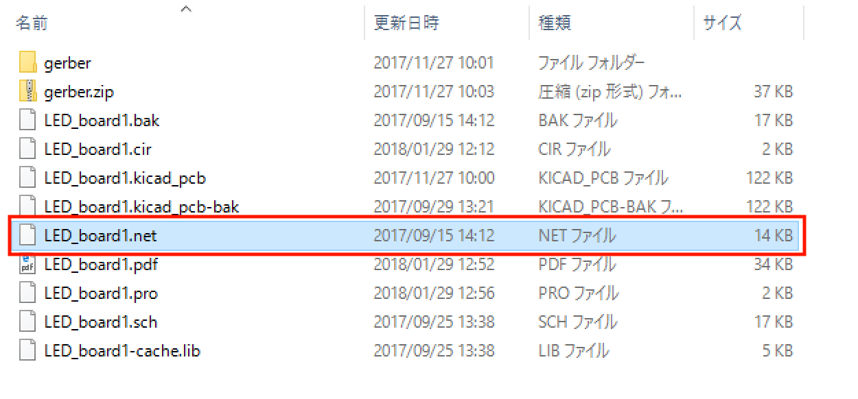 今回のプロジェクト名は「LED_board1」なので、「LED_board1.net」というネットリストになります。