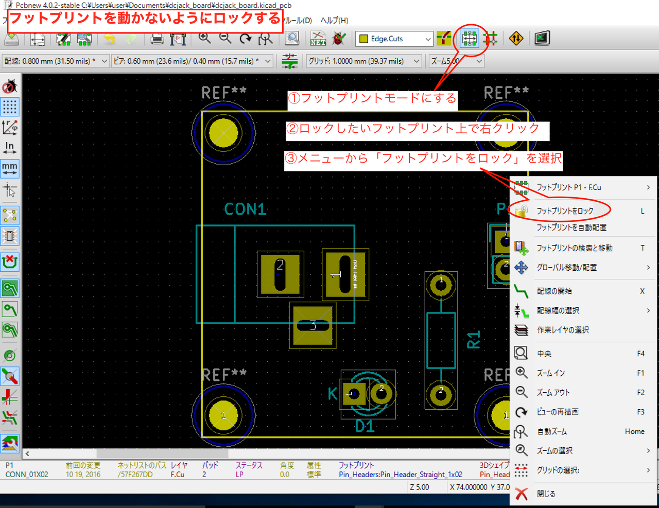 - 右クリックメニューから「フットプリントをロック」を選択します。