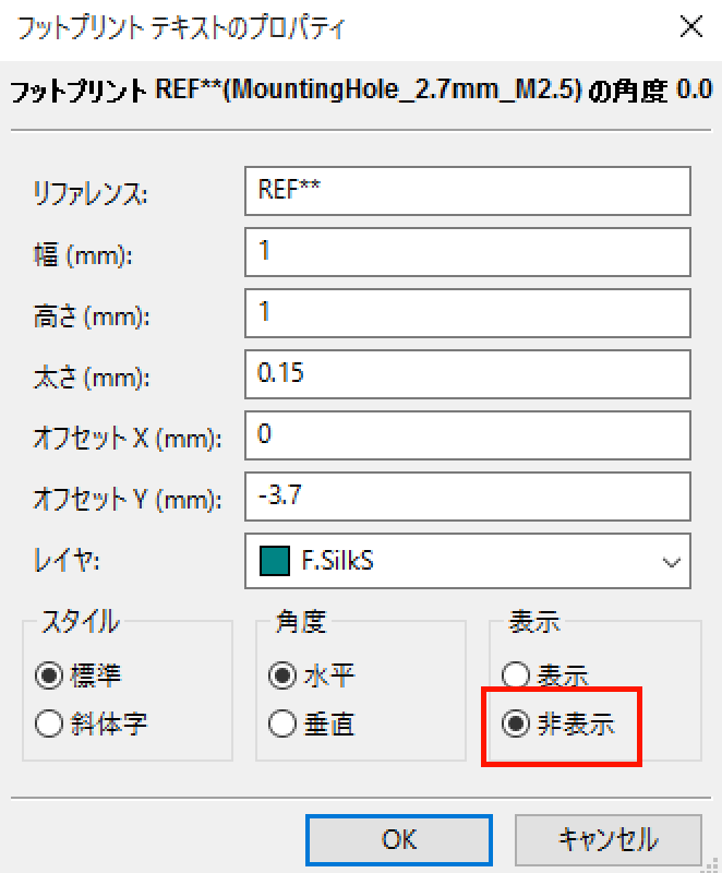 これは特に基板に表示する必要がありませんので、非表示にしたいと思います。
