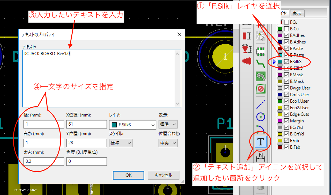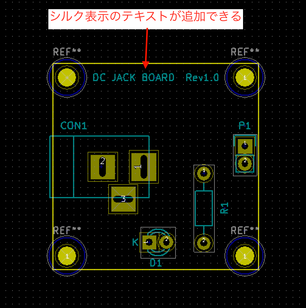 基板上に名称など任意のシルク表示を追加したい場合があるかと思いますのでその方法を紹介します。