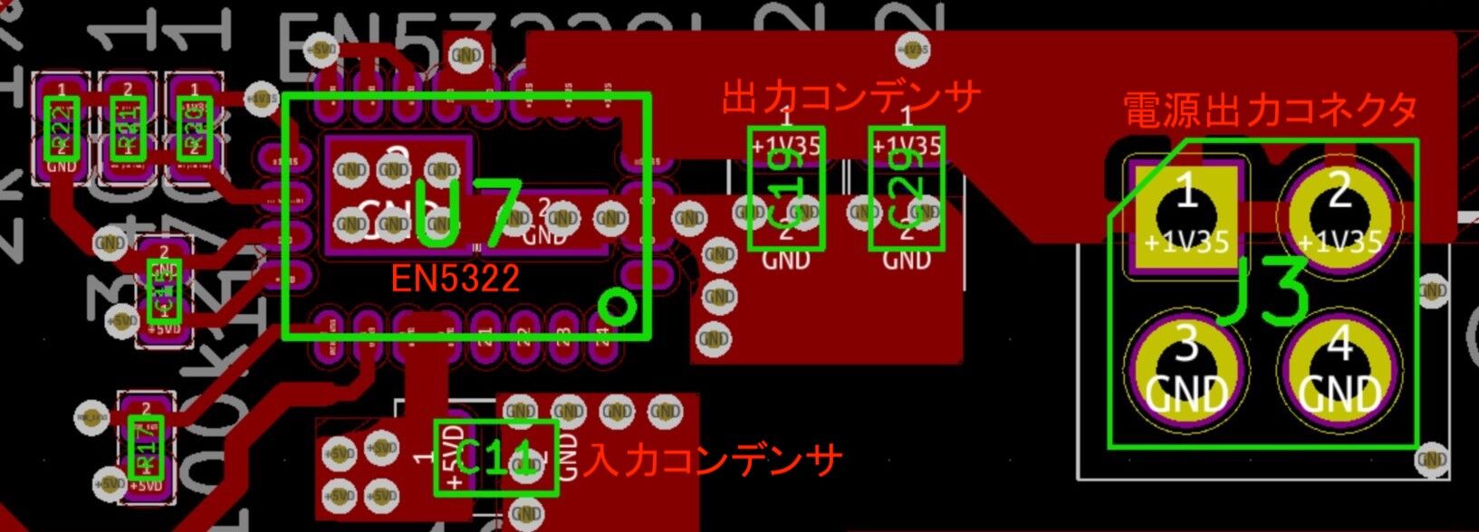 本当はデータシートに載っている推奨レイアウトにするのが良いと思うのですが、今回は6系統の電源回路でEN5322を6個配置する必要があり、少しでも基板サイズを小さくするために推奨レイアウトとは若干異なる配線パターンにしました。