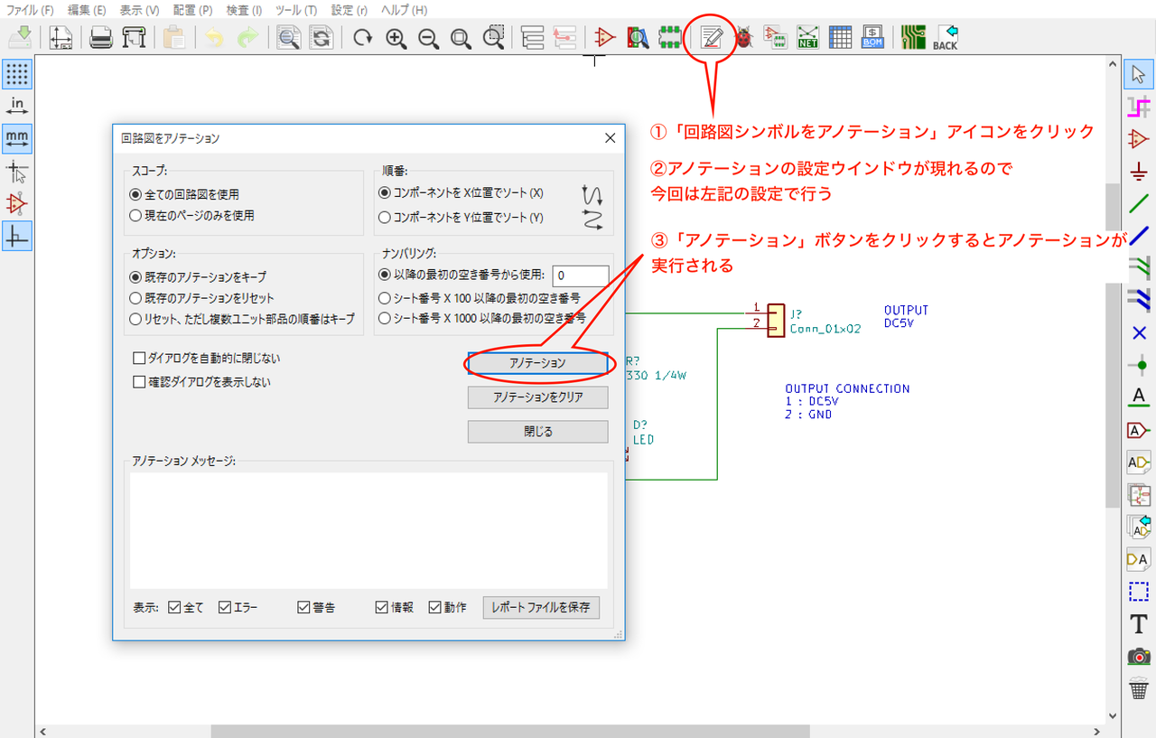 - 上側のツールアイコンの「回路図シンボルをアノテーション」アイコンをクリック