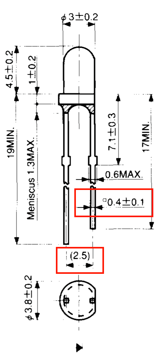 一般的な砲弾型LEDのリードピッチは2.54mm、リード径は0.4〜0.5mmです。