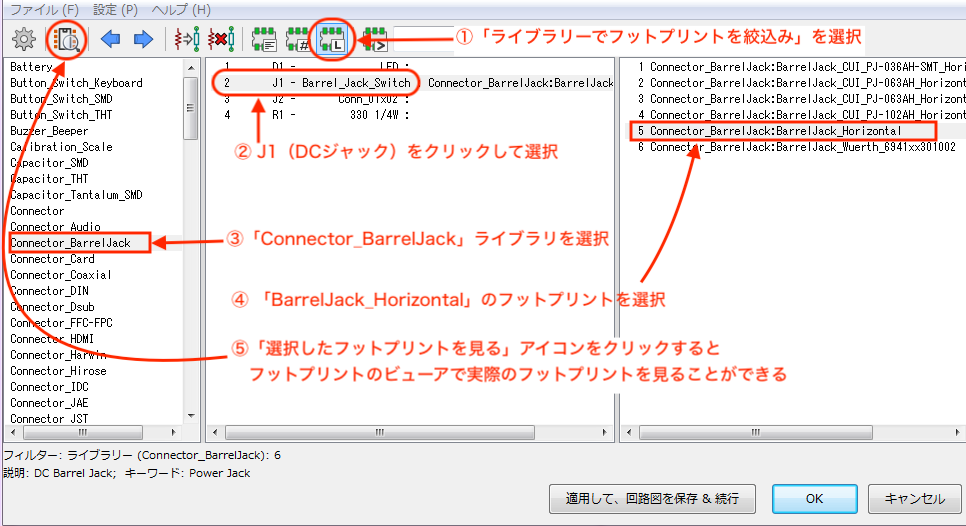 - 左側にフットプリントのライブラリが表示されているので、この中の「Connector_BarrelJack」を選択すると、右側にConnector_BarrelJackライブラリ内のフットプリントが表示されます。