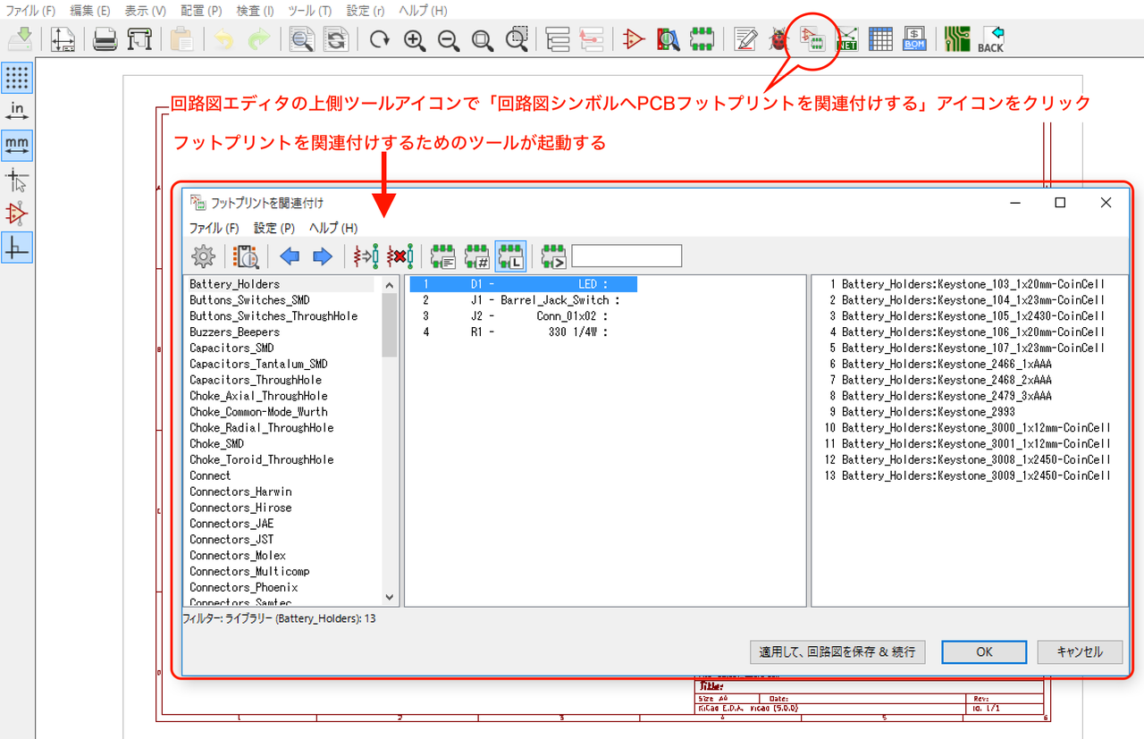 - 上側のツールアイコンで「回路図シンボルへPCBフットプリントを関連付けする」アイコンをクリックすると起動します。