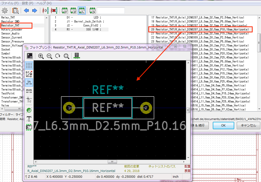 「Resister_THT」ライブラリの「R_Axial_DIN0207_L6.3mm_D2.5mm_P10.16mm_Horizontal」がフットプリントの修正が必要なく適当と考えられますので、これをそのまま使用することにします。