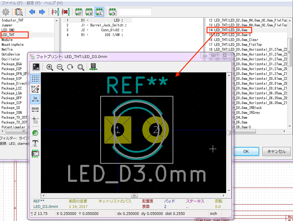 対応するフットプリントは「LED_THT」ライブラリの「LED_D3.0mm」が修正の必要もなく適当であるため、これを使用することにします。