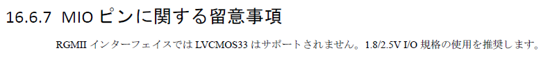 PS部のMIOに接続する場合、外部のPHY(トランシーバ)とはRGMIIインターフェースで接続します。MIOは1.8V〜3.3Vが設定できますが、PS部のギガビットEthernetコントローラーでは3.3VのI/O電圧はサポートされないようです。(ネットで調べてみる限りでは、動作はするがメーカーとしては非推奨のようです)