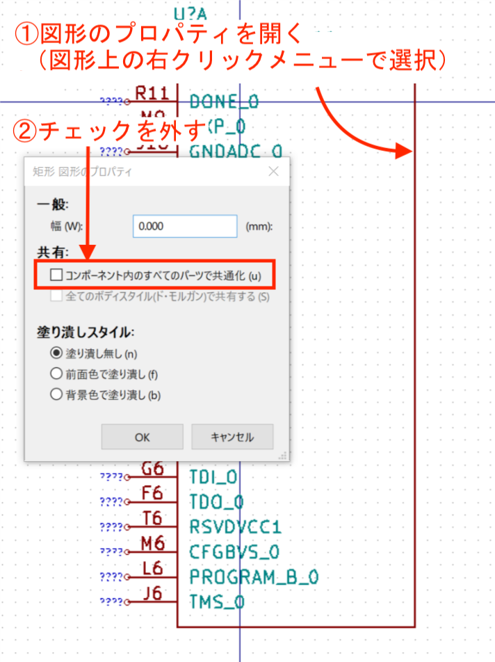 - 図形のプロパティ画面で「コンポーネント内の全てのパーツを共通化」のチェックを外す